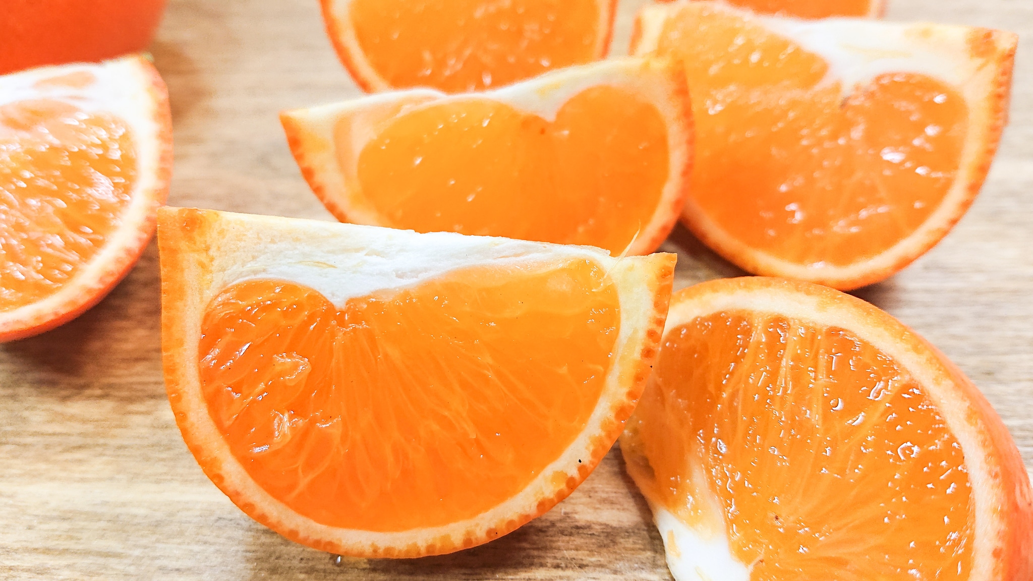 果皮は滑らかで薄くて、手で皮を剥いて食べることができますが、剥きにくさもあるので、剥きにくく感じられる場合は、オレンジのようにカットしてお召し上がりできます。