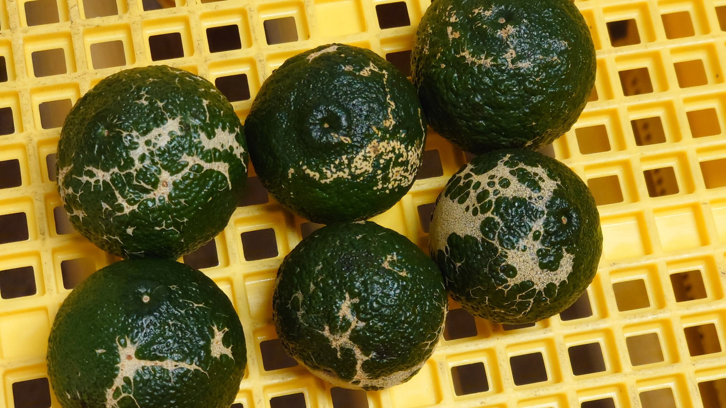 写真6枚目 トゲ傷や打ち身によって黒くなっている部分の多い物(青ユズは収穫直後は果皮が弱く繊細です)